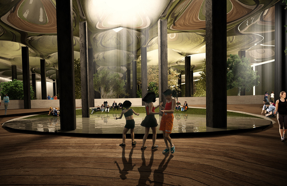 這個位於紐約東城區的地下公園佔地60,000平方尺(超過1萬8000坪),原先是一座電車終點站,建於1903年,在1948年時關閉閒置。原本的車站設計十分復古,有鵝卵石路面、巨大的鋼梁、縱橫交錯的鐵軌、還有挑高20英尺(6米高)的拱形天花板。在概念設計圖中,可以看到巨大鋼樑撐起寬闊的地下空間,視野相當開闊,上頭有太陽光照耀,一旁有蓊鬱植物環繞,還有水池和草坪可供嬉戲,簡直就和地面上的公園一模一樣,而且還不受下雨、寒冷等氣候條件干擾,隨時都可以造訪。