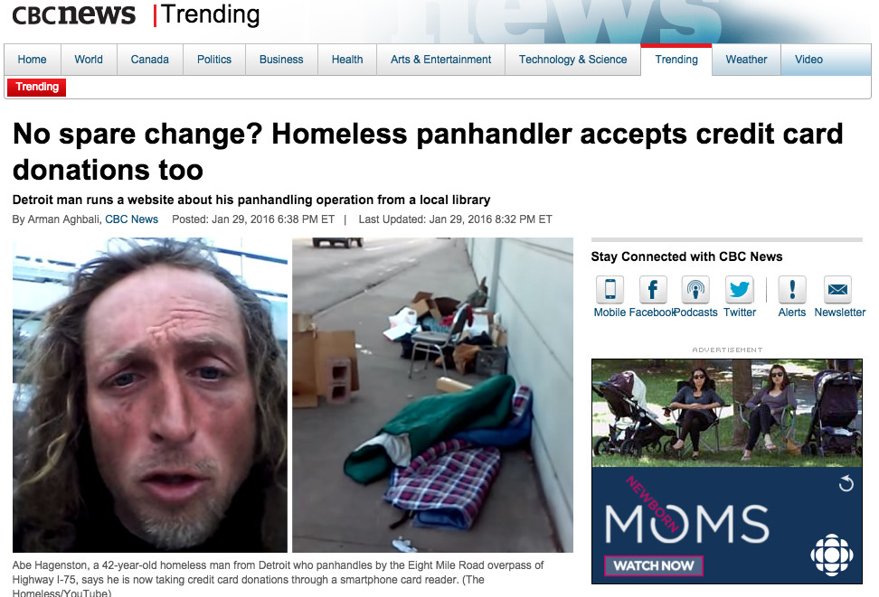 看到流浪漢想要給點零錢幫助,但卻發現身上一個銅板都沒有?美國底特律一名流浪漢哈根斯登( Abe Hagenston)發現了這個問題,想出一個絕佳的好方法,那就是接受信用卡捐款!