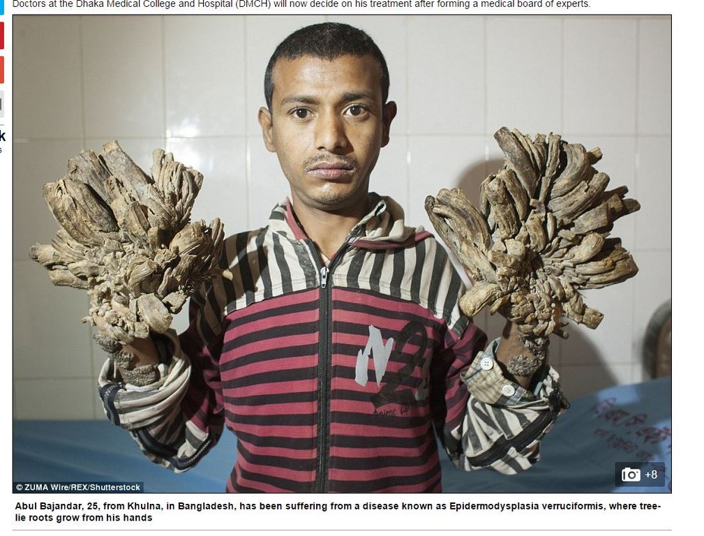 根據《每日郵報》報導,孟加拉庫爾納(Khulna)25歲車夫巴恩達(Abul Bajandar)7年前罹患遺傳性皮膚疾病「疣狀表皮發育不良(Epidermodysplasia Verruciformis EV)」後,手腳便開始增長疣塊,同時隨著時間推移,疣塊更大量生長,讓他如同樹人一般,無法過正常人的生活。