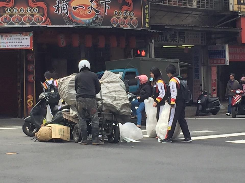 一名男網友在「爆料公社」上傳照片詢問,「這是哪一家的學生?」並表示,年老的伯伯機車上的資源回收散落一地,一旁的高中生馬上主動幫忙維持交通與後續處理。