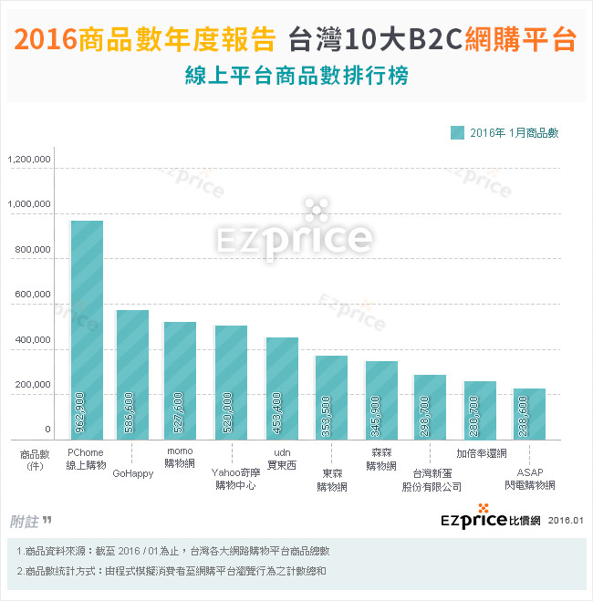 景氣寒,整體電商市場依舊穩定成長,EZprice比價網繼去年7月發布台灣各網購平台商品數調查後,今日再發布持續關注各電子商務的商品數現況,PChome線上購物再度以直逼百萬件商品數量蟬聯冠軍;GoHappy繳出歷來最佳成績,奪下亞軍;新蛋全球生活網今年新入榜就登上第8名。