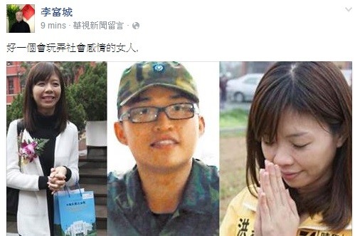 國會新科立委1日天完成就職,時代力量當選的立委洪慈庸,曾說過是弟弟洪仲丘給她的能量才進立法院,她不會忘記為軍人的人權做努力,外界猜測她會進入國防外交委員會,但她竟透露希望能進入教育文化委員會或衛生環境委員會。對此,氣象主播李富城似乎不滿地表示,「好一個會玩弄社會感情的女人」。