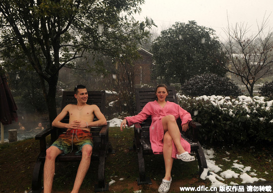 據《中國新聞網》報導,來自美國、俄羅斯、愛爾蘭等18國的36名海外留學生們,1日在湯溪鎮九峰溫泉風景區體驗「雪中泡溫泉」,眾人開心打水仗,體驗冰火兩重天的刺激快感。