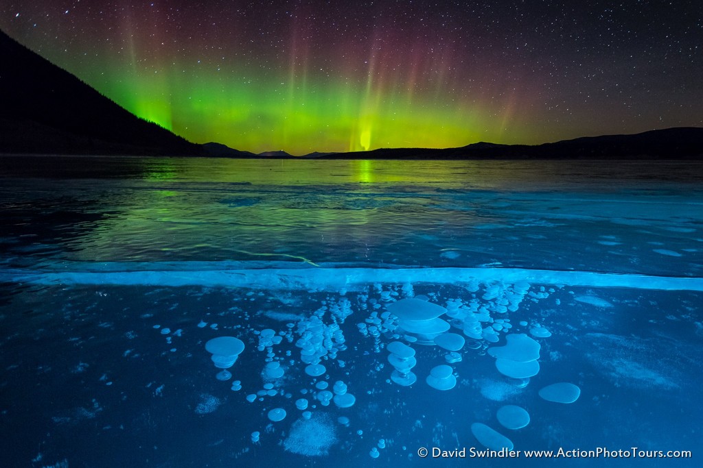 來自美國猶他州(Utah)的攝影師大衛(David Swindler)先前到加拿大洛磯山脈(Canadian Rockies)露營時,幸運地拍攝到亞伯拉罕湖(Abraham Lake)裡的冰氣泡(ice bubble),再加上北極光照映在冰凍的湖面上,場面相當壯觀,大衛也說自己享受了一段拍攝冰氣泡的美好時光,是他們「這禮拜看過最棒的表演」。