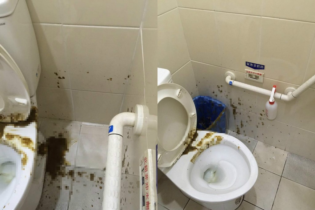 照片中,廁所被屎噴射地亂七八糟,不只馬桶外圍都遭受轟炸,一旁的地板也難逃一劫,甚至連牆上都被屎炸到,超商員工看完只能嘆,「這位屁股歪一邊的客人,外面的廁所雖然不是你家的,但請你也尊重我們服務業!上廁所的時候可以瞄準一點...」