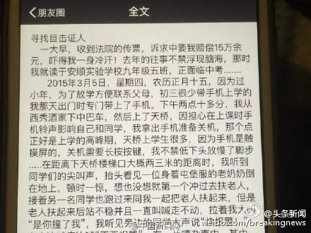 周楊還表示,當時的同學都各自上了不同的高中,而他也不清楚當時一起扶老人的同學叫甚麼名字,所以希望通過自己的PO文,「找到當時在天橋上目睹一切的同學們來作證,還原事實的真相。 」