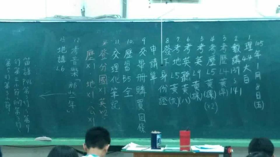 還記得國中時黑板上滿滿10幾點功課清單,提醒明天得交什麼作業,要考國文英文哪幾章嗎?桃園市議員王浩宇在臉書PO照表示,這就是國中生的日常。看完網友們超有感,紛紛表示「印象中更多」、「沒有10項還不習慣勒」。