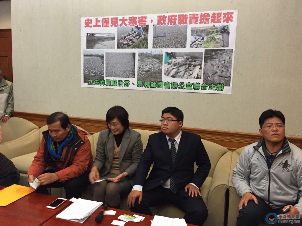 寒害侵襲養殖漁業,讓漁民紛紛苦不堪言,民進黨立委蘇治芬、蔡易餘、葉宜津等人2日召開記者會,同時邀來漁民代表及漁業署官員協調處理救災補助規定,蘇治芬3日透過新聞稿表示,中央政府對漁民的的補助規定嚴苛,在記者會上相關官員仍態度強硬,因此3日特別集結12名立委,向張善政爭取漁民權益。