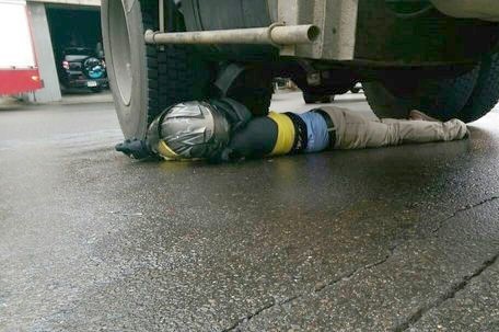 桃園25歲的黃姓男子昨日(3日)上午騎機車行經楊梅區環東路時,疑似因天雨路滑緊急煞車摔倒,沒想到卻連人帶車直接滑進聯結車底,只差10公分就會慘遭「爆頭」。大概是因為驚嚇過度加上被安全帽勒住,黃男一度沒有呼吸心跳,所幸經過急救後已無大礙。
