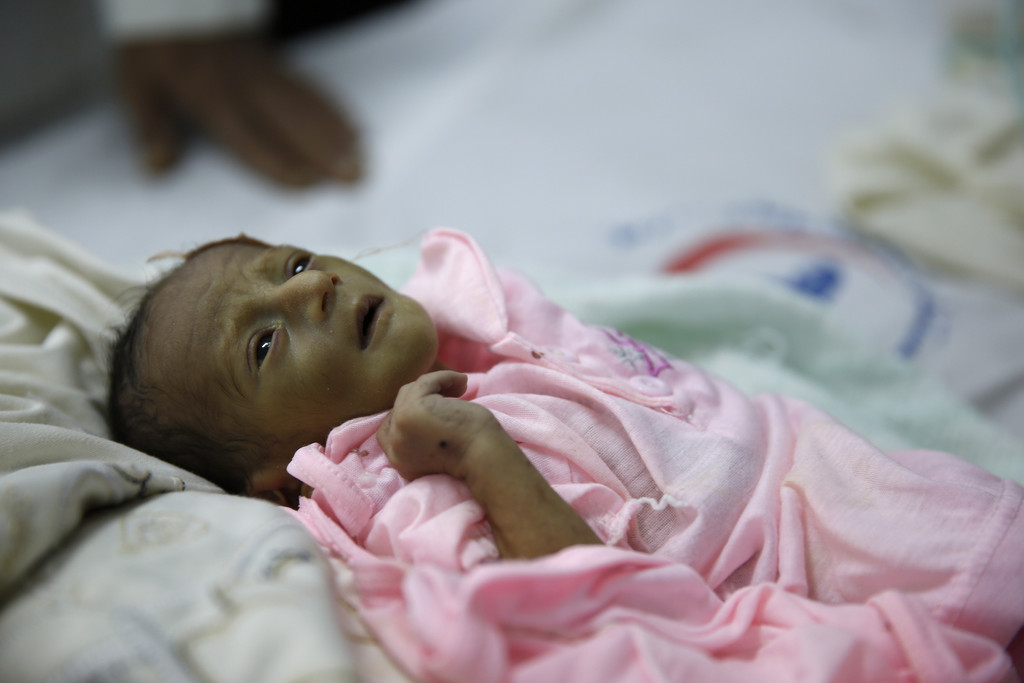 ▲葉門首都薩那的醫院裡,一名嚴重營養不良的孩子正在生與死的天秤上掙扎。(圖/達志影像/美聯社)