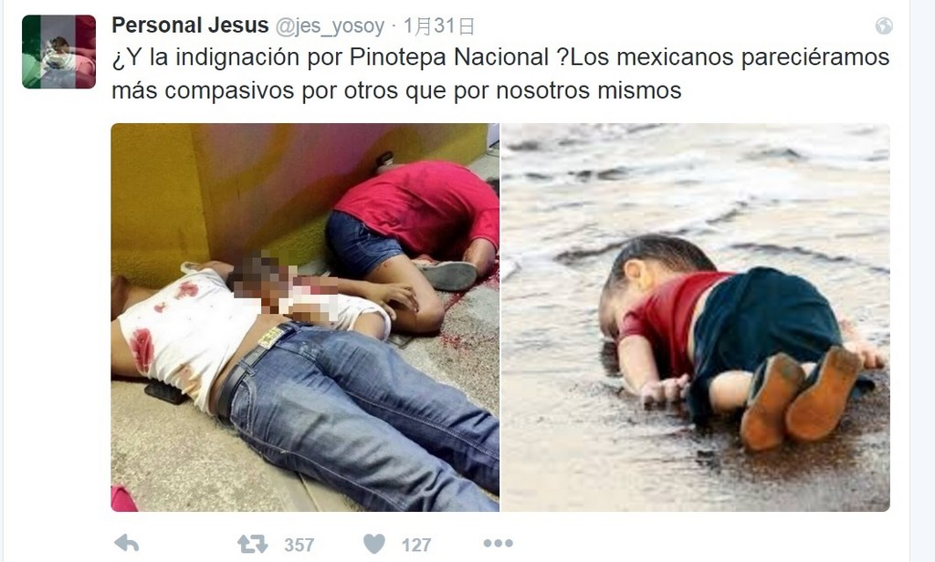 無辜的嬰兒竟成為槍下亡魂!墨西哥上月(1月)29日發生槍擊案件,槍手不僅射殺了年輕夫妻,甚至連身旁7個月大的小男嬰也不放過,全都殺死,事後警方逮到4名有黑道背景的嫌犯,此案引發網友們撻伐,有人將這張一家三口遇害的照片,和當初敘利亞小男童伏屍照放一起,希望大家重視兒童遭殺的問題。