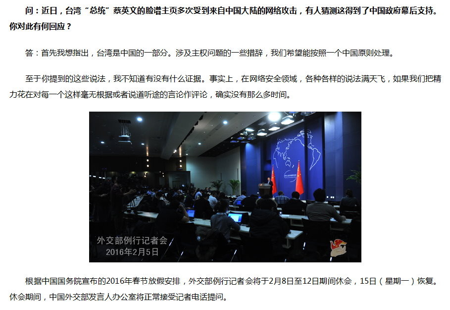這項例行記者會由大陸外交部發言人陸慷主持,有媒體提問,「近日,臺灣總統蔡英文的臉譜(臉書)主頁多次受到來自中國大陸的網路攻擊,有人猜測這得到了中國政府幕後支持。你對此有何回應?