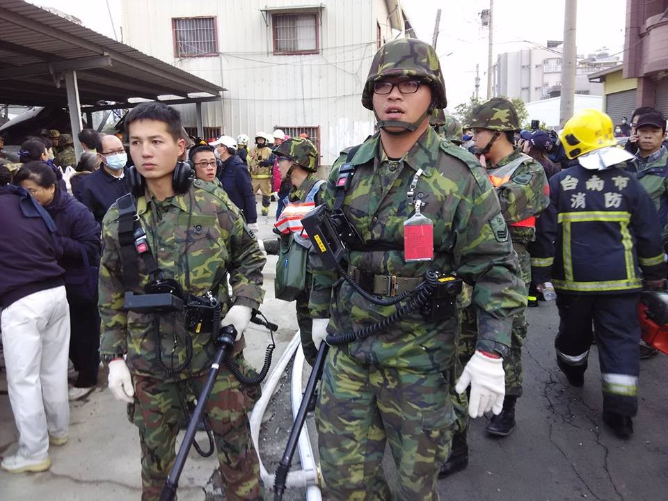 高雄美濃6日清晨發生規模6.4淺層大地震,台南市傳出多棟大樓傾斜、倒塌,並有民眾受困。國防部表示,目前已派遣陸軍裝甲564旅、54工兵群、陸軍砲訓部、陸軍43砲指部、陸軍4支部、陸軍步兵203旅、陸軍特戰指揮部、陸軍航空特戰指揮部、空軍第443聯隊等官兵約810人、車輛38輛、生命探測器24組等各式裝備執行救援任務。