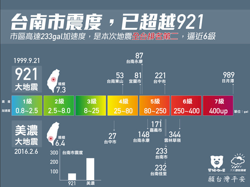 「天氣即時預報」指出,台南市同樣都是震度5級,921大地震時地表加速度僅有「87gal.」,本次美濃地震則有「233 gal.」,搖晃約25秒以上,因此會比較有感。