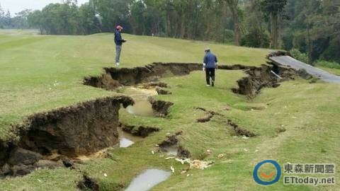高雄市美濃區凌晨3時57分發生規模6.4有感地震,台南頻頻傳出嚴重災情。有網友提供台南大內區南寶高爾夫球場地面,地震後產生嚴重裂痕,高低差大,非常驚人。