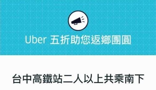 Uber於臉書專頁PO文,昨夜凌晨地震影響部分交通運輸,中部以南高鐵也暫時全面停駛,許多民眾無法如期順利地回到中南部的家鄉,我們希望在小年夜的今天可以成為您的幫助,帶您安全的回家團圓。今日(2/6)全日,台中地區即刻取消浮動加成計費,現在起至2/6晚間22:00為止,只要您在台中高鐵站搭車前往台中以南區域,多人共乘 Uber 並使用車資分享功能,並輸入序號「HOME2016」,該趟南下行程可折抵50%車資。