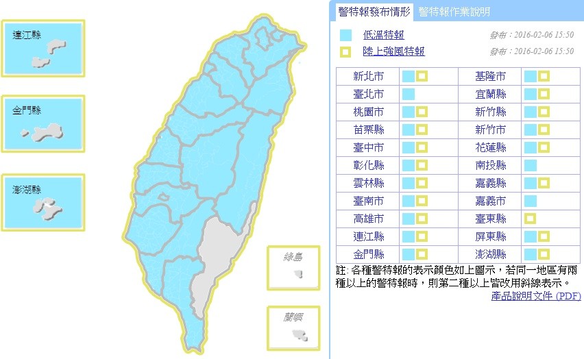 氣象局6日下午3時50分針對全台21縣市發布低溫特報,指出受寒流及輻射冷卻影響,氣溫明顯偏低,西半部、東北部、東部地區及澎湖、金門、馬祖早晚將出現10度以下低溫。