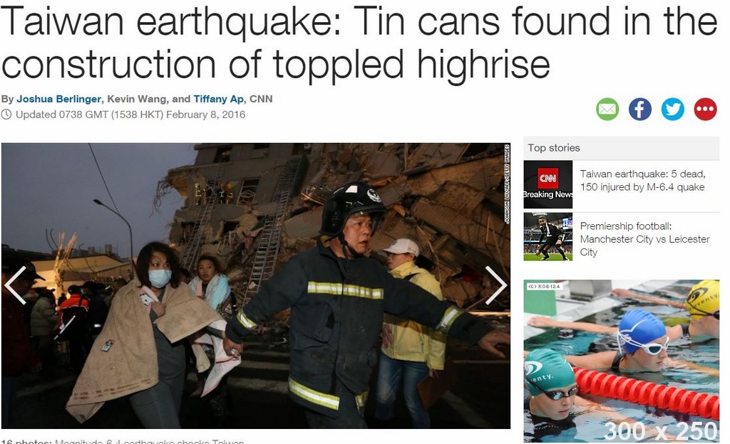 南台灣6日發生規模6.4強震,造成嚴重災情,搜救行動目前也在持續進行中,迄今仍有116人失聯,引起國際間關注。美國有線電視新聞網為此以《倒塌大樓結構發現沙拉油桶》為題報導。