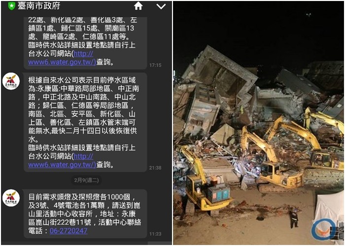 台南市府正全力救壓在維冠金龍大樓底下的民眾,市政府9日上午11點多發訊息,表示現在他們需要頭燈及探照燈各1000個,以及電池1萬顆,希望大家能送到指定地點,提供給救難人員。另外也有民眾在「爆料公社」貼文表示自己在現場,非常需要大量的小圓鍬,約45公分。