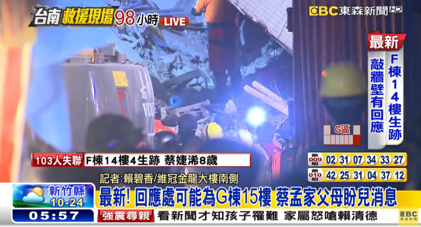 另外,賴清德表示,搜救人員破壞了一條鋼樑,但是還有四面牆阻擋,生還者在廢墟裡沒有進食、沒有飲水,生命跡象越來越微弱,但是目前受困者還是持續敲牆回應,搜救人員會盡力救援。