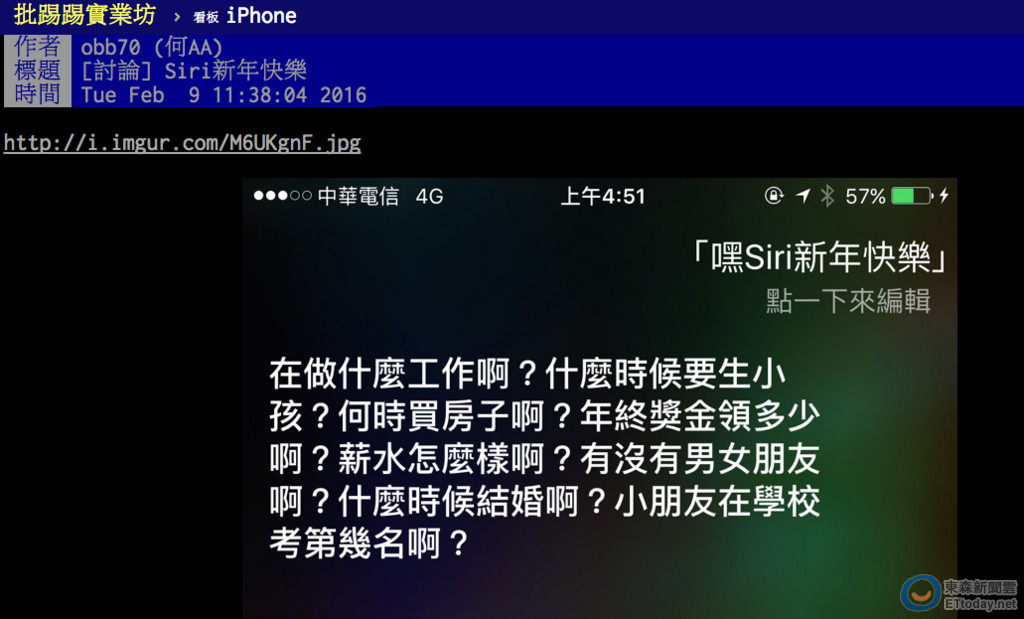 今天是大年初三,有PTT網友分享他自己在家向Siri說:「嘿!Siri新年快樂」,結果得到的回應是「在做什麼工作啊?什麼時候要生小孩?何時買房子啊?年終獎金領多少啊?薪水怎麼樣啊?有沒有男女朋友啊?什麼時候要結婚啊?小朋友在學校考第幾名啊?」讓他氣得直接在 PTT 論壇上分享,並說:「閉嘴啦 煩死了」