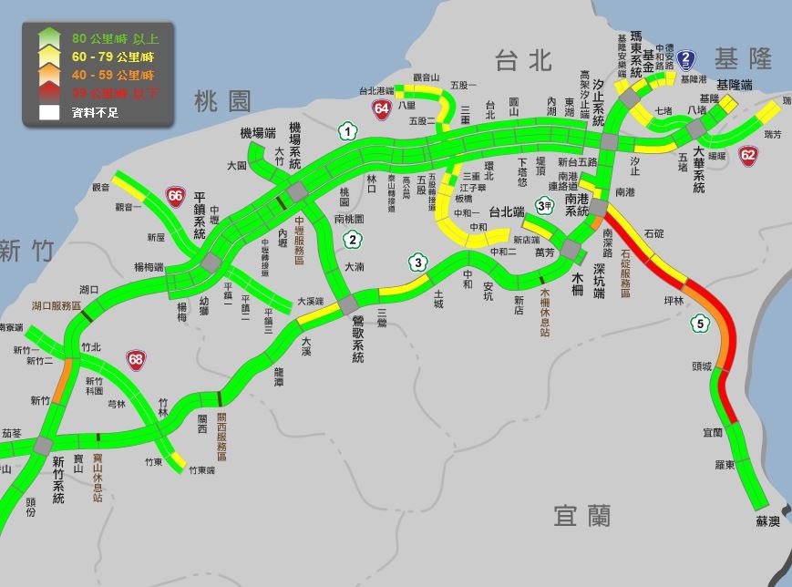 根據高公局路況資訊,國道5號南向往宜蘭方向上午開始出現堵塞,南港至石碇路段一早車速只有30公里,到大約10點左右才恢復到60公里左右的車速,不過卻換成石碇往坪林方向壅塞,時速不到30公里。而往北方向也逐漸出現車潮,頭城至坪林路段時速才30公里左右,宜蘭至頭城路段也不到60公里。