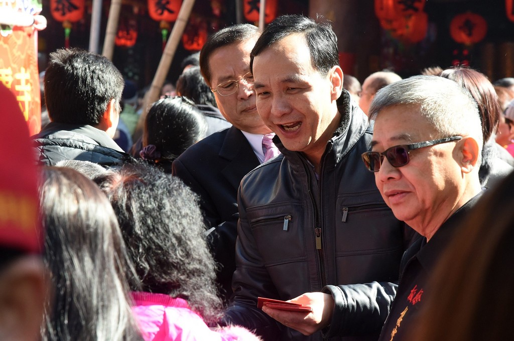 ▲朱立倫在參拜後發放紅包給在場民眾,祝福大家新的一年平安健康。(圖/新北市政府,下同。)