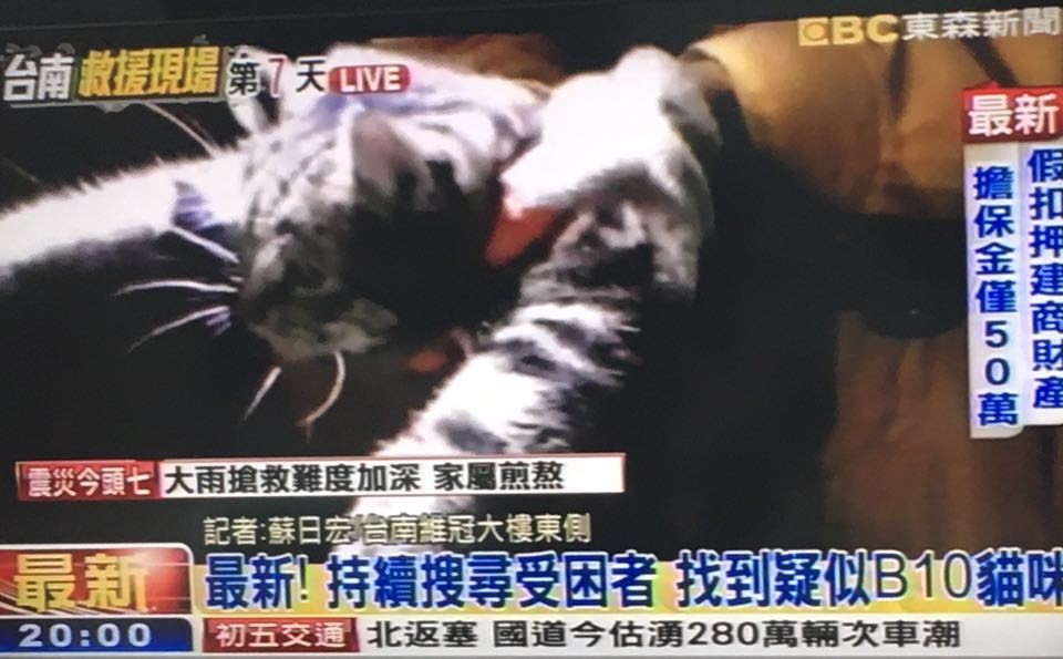 台南地震發生至今已經第7天,搜救行動持續進行。搜救人員在今(12)日晚間8時左右在B棟10樓,找到一隻受困的貓咪。貓咪被救出時情緒並無太大的波動,乖乖地依偎在搜救人員的懷裡。