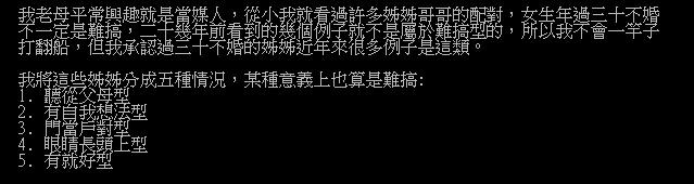 PTT八卦板最近有一篇文章標題為《30多歲的女孩是不是最難追呢?》的討論串,引發許多網友討論,其中一位網友表示,因母親喜歡替人作媒,因此看過許多30多歲未婚女性的案例,雖然,「女生年過30不婚,不一定是難搞」但近年來很多案例可以分類為下列五大類型: