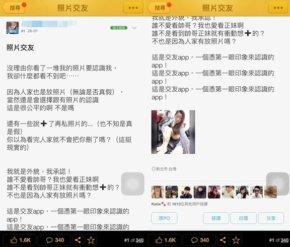 除此之外,原PO正妹也強調網路世界的殘酷事實,儘管先加好友再私訊給圖,不論真實與否、對方不滿意還是會把你刪掉打入冷宮。就有男生委屈提到,「照騙」交友天天上演,外表不一定靠譜。其實從交友app上不難發現,男女大頭照自介文各不相同,女孩通常取景得花費半小時,光是45度角縮下巴、擠乳溝的自拍神照就能上傳好幾10張;男孩就更抽象了,常常製造神祕感覺,不是放戶外風景照、就是只拍單一部位,例如眼睛、胸肌等,甚至是模糊失焦的臉部特寫,讓人一看就難以捉摸、連忙按叉叉關視窗。