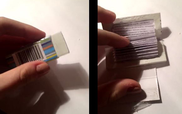 影片中這塊橡皮擦看起來跟市面上販售的沒什麼兩樣,但是它的功能不在於擦拭寫錯的答案,卻是在考試時幫助你「開天眼」,看到答案!將包住橡皮擦的包裝小心拆開,竟然它的本體是由一頁一頁的小抄組合而成,這真是太讓人驚奇了,不僅需要靈巧的手藝技巧,還要有邪惡又聰明的腦袋才能成就這塊橡皮擦呀!