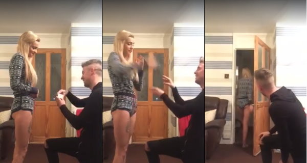 到底是講了什麼話,讓這名金髮正妹當場怒飆髒話呢?根據英國《每日郵報》(Daily Mail)報導,這名男子漢斯(Brad Holmes),情人節當天想要給女友戴維斯(Jenny Davies)一個驚喜,當時他拿著一個白色的小盒子,慢慢靠近正在沙發上看電視的女友,隨後向她單膝下跪。