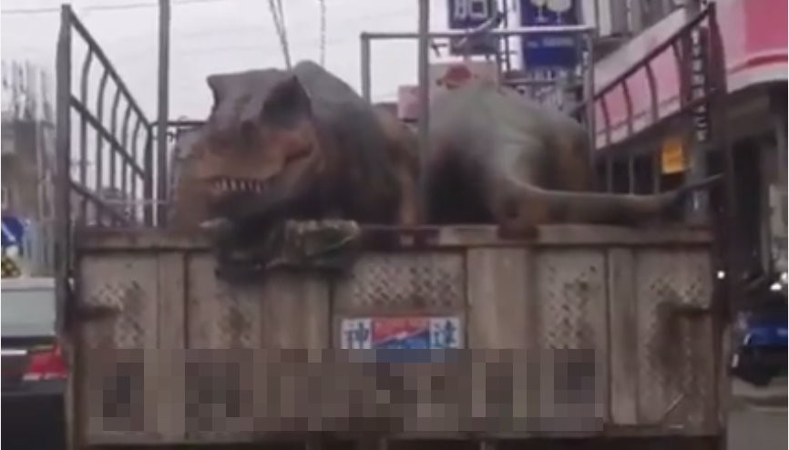 對此,業者表示,這些是過年期間在小叮噹科學主題樂園展覽的恐龍模型,撤展後運回公司途中,工作人員進入模型內防止墜落車外,但一時無聊,操控模型和民眾互動。