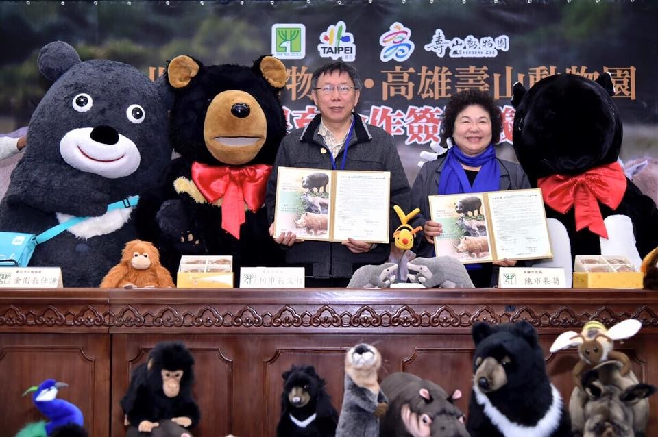 台北市長柯文哲與高雄市長陳菊17日共同簽訂「臺北巿立動物園與高雄巿壽山動物園動物保育合作備忘錄簽訂」記者會,柯強調,這次台北市立動物園將送一對侏儒河馬、一對伊蘭羚羊、一頭雄性白犀牛及3頭北非髯羊到高雄壽山動物園,開啟兩市動物保育合作,現代動物園不應當只停留在典藏、飼養動物的「活體博物館」角色。