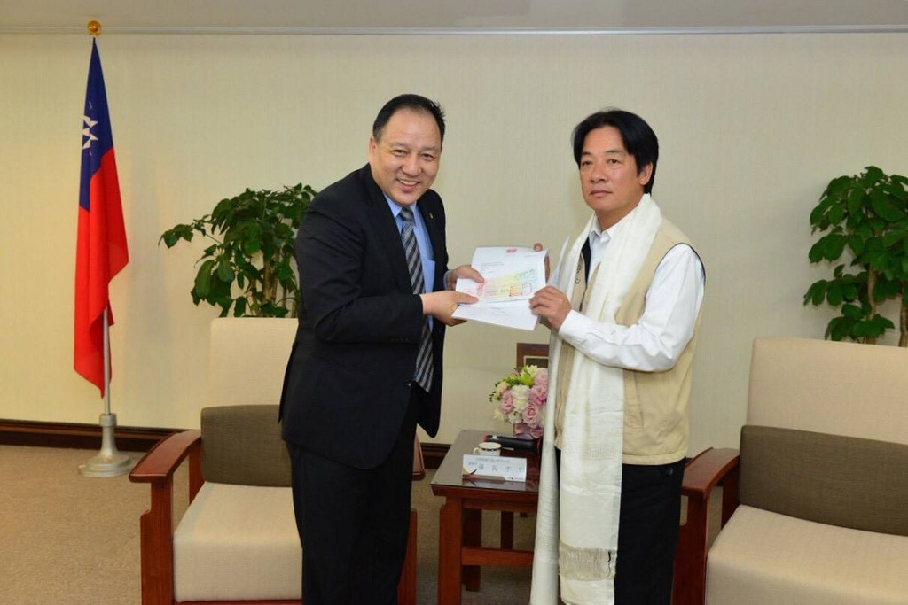 達瓦才仁17日下午赴台南市政府拜會賴清德,送上一條代表平安吉祥的西藏「哈達」白絲巾,為台南地震災民祈福,並捐贈5萬美元,作為台南震災重建專用善款,達瓦才仁表示,雖遺憾無法實際參與救災援助,但願意提供協助,幫助災後重建。