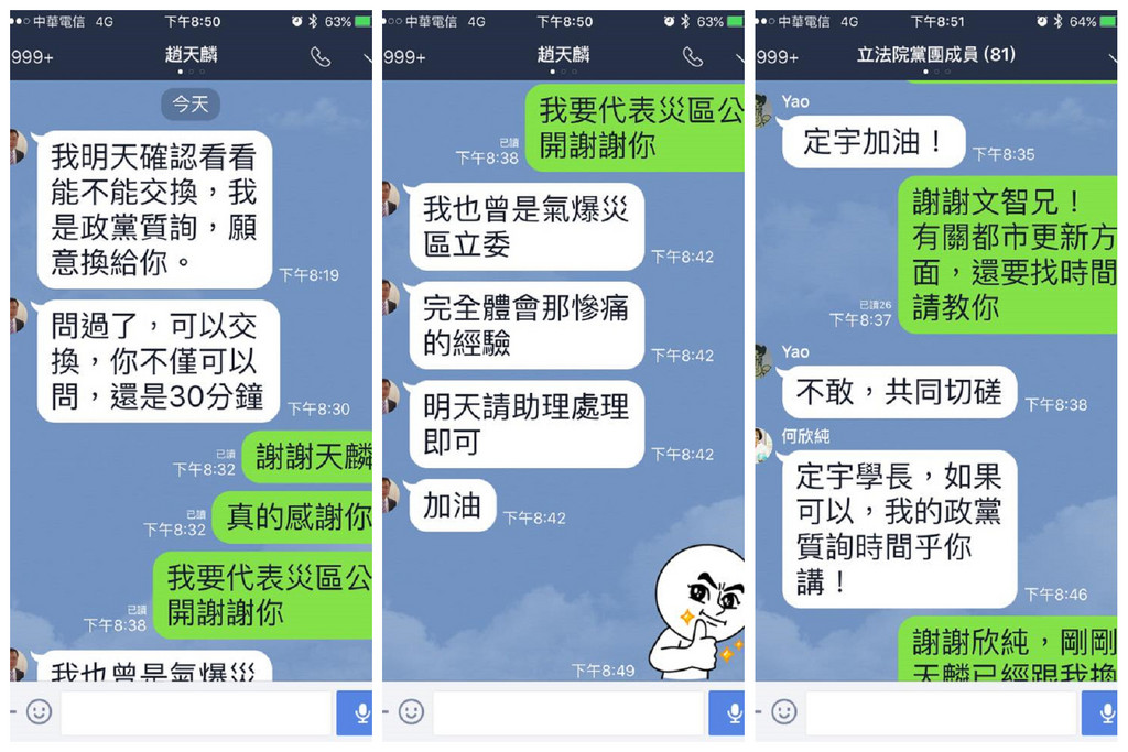 王定宇16日晚間在臉書上貼出LINE對話記錄指出,由於自己並未抽到政黨質詢,民進黨立委趙天麟向他表示,過去他也曾是氣爆災區立委,完全能體會那慘痛的經驗,因此願意把質詢時間裡讓給王定宇,而立委何欣純也表態願意幫忙,讓出時間。