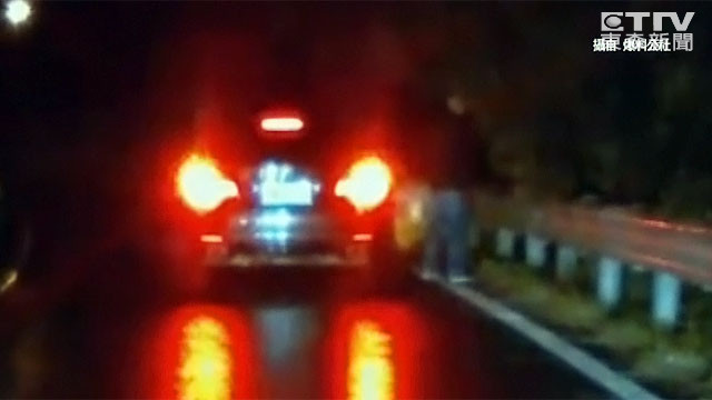 行車記錄器拍下前方一輛黑色轎車打警示燈停在路邊,右邊一名穿黑色衣的男子面向護欄正在尿尿,隨後慢慢走到車子後面,但沒有走回駕駛座,而是停了下來望向其他車道,似乎在發呆,讓在後面等著要經過的駕駛非常無奈,只能打方向盤往左邊車道開走。