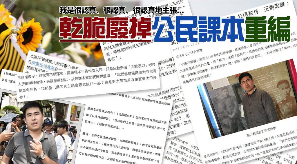 太陽花學運編入教科書內惹議,新黨發言人王炳忠17日在臉書上表示,如此偉大的太陽花革命照片怎麼能和那些反動的民主議會觀念放在一起,建議公民課本廢掉重編,卻被外界解讀成是在諷刺太陽花,他則再度發文說:「我是很認真、很認真、很認真地主張『乾脆廢掉公民課本重編』」。