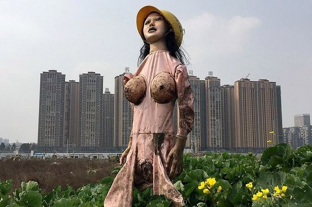 ▲大陸成都一名農夫十分前衛的用了「性愛充氣娃娃」來擔任稻草人「趕鳥」!(圖/翻攝自網路)