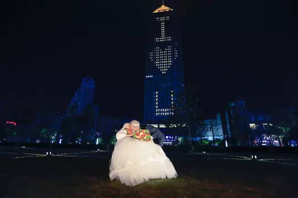 張先生找上開元名都大酒店,並說明自己的想法,雙方一拍即合,在情人節當天,酒店靠街的這面牆220間房間全保留,利用房間的燈組成「I ❤ U」圖形,讓兩老穿上婚紗完成合影。