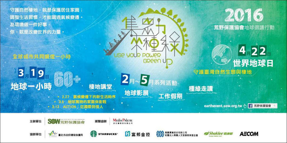 社團法人中華民國荒野保護協會於每年三3月起至5月間籌辦「地球倡議」守護行動,串連兩大國際環境節日,喚醒全民環境意識。今年首場大型國際環保行動「地球一小時Earth Hour」將於3月19日晚間20:30到21:30展開,次活動以「Many Species, One Family」(萬物家人)為倡議的核心價值,號召民眾主動採取行動守護地球,集結全球172個國家、7,000多座城市一同為環境做好事。