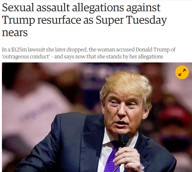 英國《衛報》25日報導,美國總統大選重量級初選:「超級星期二」黨團會議投票將於下周舉行,共和黨參選人川普之前起涉及的一起性侵案此時又被重提往事。