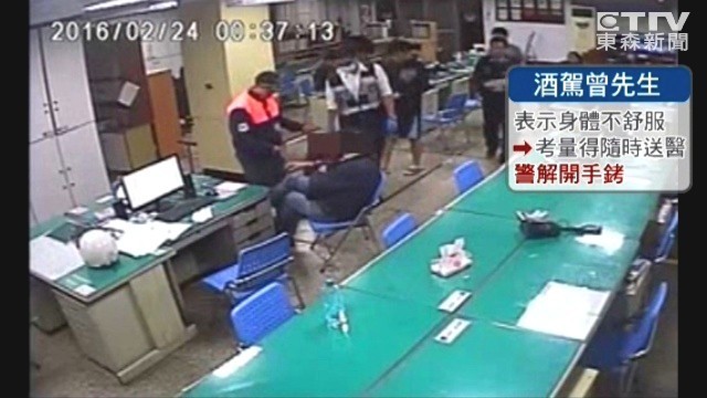 鄭育昇:小姐,這就是我跟你講的,你只知道第二段,第一段他到的時候,你可能還沒到派出所,當時他就是上銬、銬在柱子旁邊,他就講說不知道是喝酒、喝酒的關係,不知道有沒有撞到?身體非常不舒服,我們才會從隔壁叫我們警消同仁看看要不要趕快把他送醫。