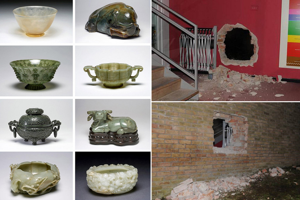 14名被告受僱於愛爾蘭犯罪集團「拉庫奇爾流浪者」(Rathkeale Rovers),他們先後後闖入劍橋大學菲茨威廉博物館(Cambridge's Fitzwilliam Museum)及德拉姆大學東方博物館(Durham's Oriental Museum)偷走犀牛角、碧玉龍紋洗、德化瓷雕、珠寶等中國文物,在中國的黑市價高達5700萬英鎊。大部分失竊文物至今仍未被尋回。