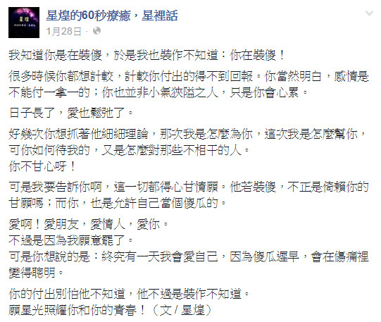 ▲文章的討論內容多元,不少以生活細節打動人心。(圖/翻攝自星煌的60秒療癒,星裡話粉絲專頁)