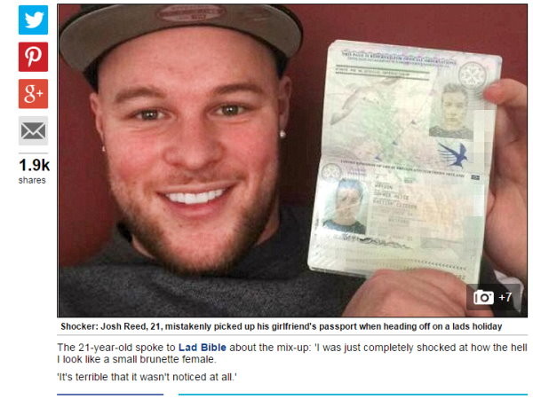 根據《每日郵報》(Daily Mail)報導,21歲的瑞德(Josh Reed)身高6尺3吋,他在夜店擔任警衛工作。日前他趁著假期,從倫敦搭機到德國去看球賽,不料抵達德國之後,才發現自己誤拿了女友的護照,於是他用駕照當成證明文件,順利入境德國。