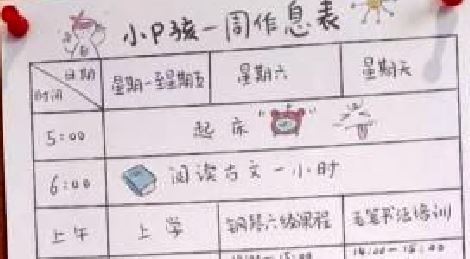 最近大陸網路上流傳著一張「小P孩作息時間表」充實的計畫引起不少網友討論。這張作息表示由一位北京大學畢業的「虎媽」所設計,9歲的小學生清晨5點就要起床,從去學校上課前先讀古文,下課以後還要看新聞、讀英文,星期六、日則要學習圍棋、跆拳道、拉丁舞等才藝,讓不少網友大嘆,「沒童年」。