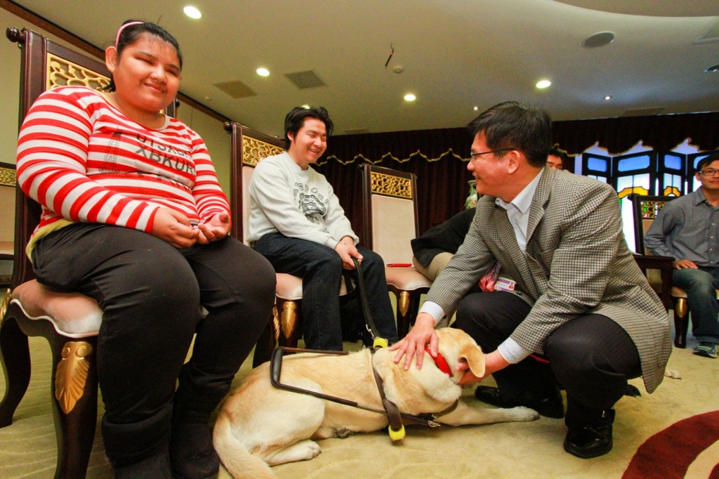 台中市視障朋友約5500多名,但目前服務中卻的導盲犬僅2隻!台灣導盲犬協會中部辦公室主任黃一山3)帶著11隻導盲犬拜會台中市長林佳龍,表達導盲犬因社會認識不足、屢遭拒絕的困境。林佳龍在聽取陳情後,允諾一定會普及導盲犬觀念,並研議用公益彩券基金補助飼育費用,減輕視障者負擔,並落實無障礙友善環境,打造視障朋友都能自在通行的「生活首都」。