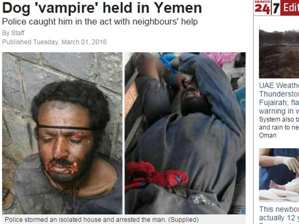 根據《emirates247》報導,這起可怕的「狗殭屍」(Dog Vampire)出沒事件,發生在葉門西部荷台達(Hudaydah)一個村落內。這名男子在自己的住處內吸狗血,被警方發現後他企圖逃跑,最後在當地所有村民的協助,男子順利被逮。