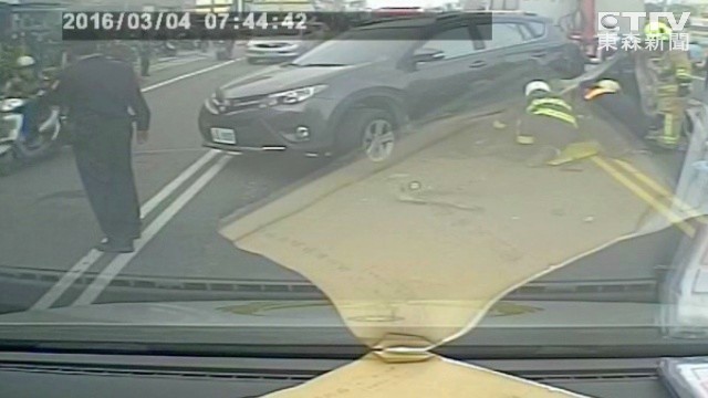 車禍發生地點在福誠高中前面,畫面中可以看到,警消趕到之後,一輛黑色休旅車斜停在路中間,機車則倒在一邊,騎士被壓在休旅車下,已經意識模糊,正想辦法將人拉出來,卻發現騎士的頭部也被輪胎壓住,救援非常困難,五甲消防隊小隊長廖明志表示,「發現患者被壓住,出動器材車用吊的方式來移動。」